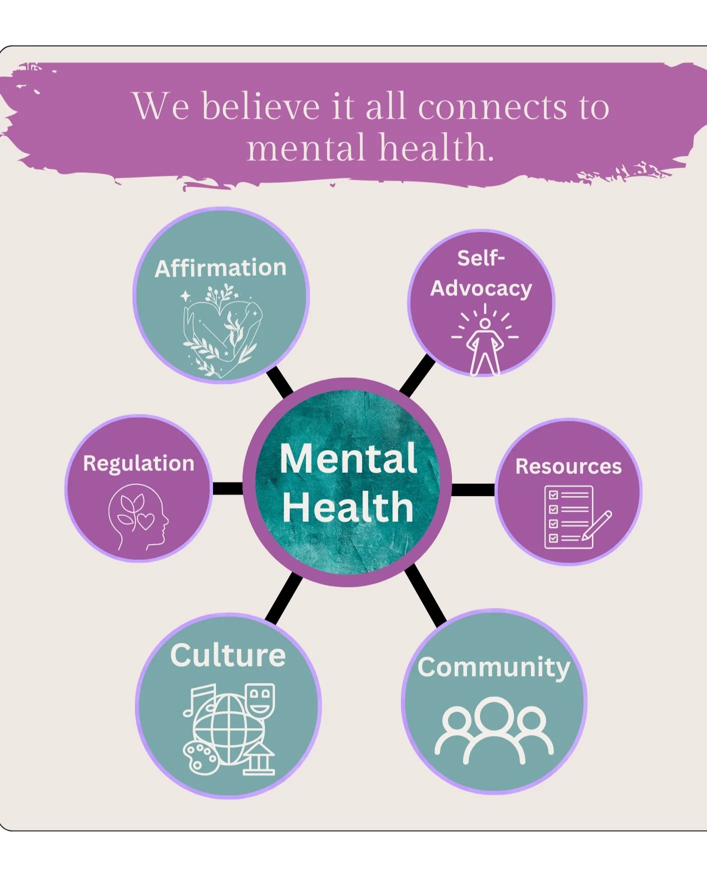 We know how difficult the struggle with mental health can be, especially as a neurodivergent individual. We believe that affirmation, community, and culture are often harder to access for neurodivergent folks, and all are essential pieces for promoting mental health.